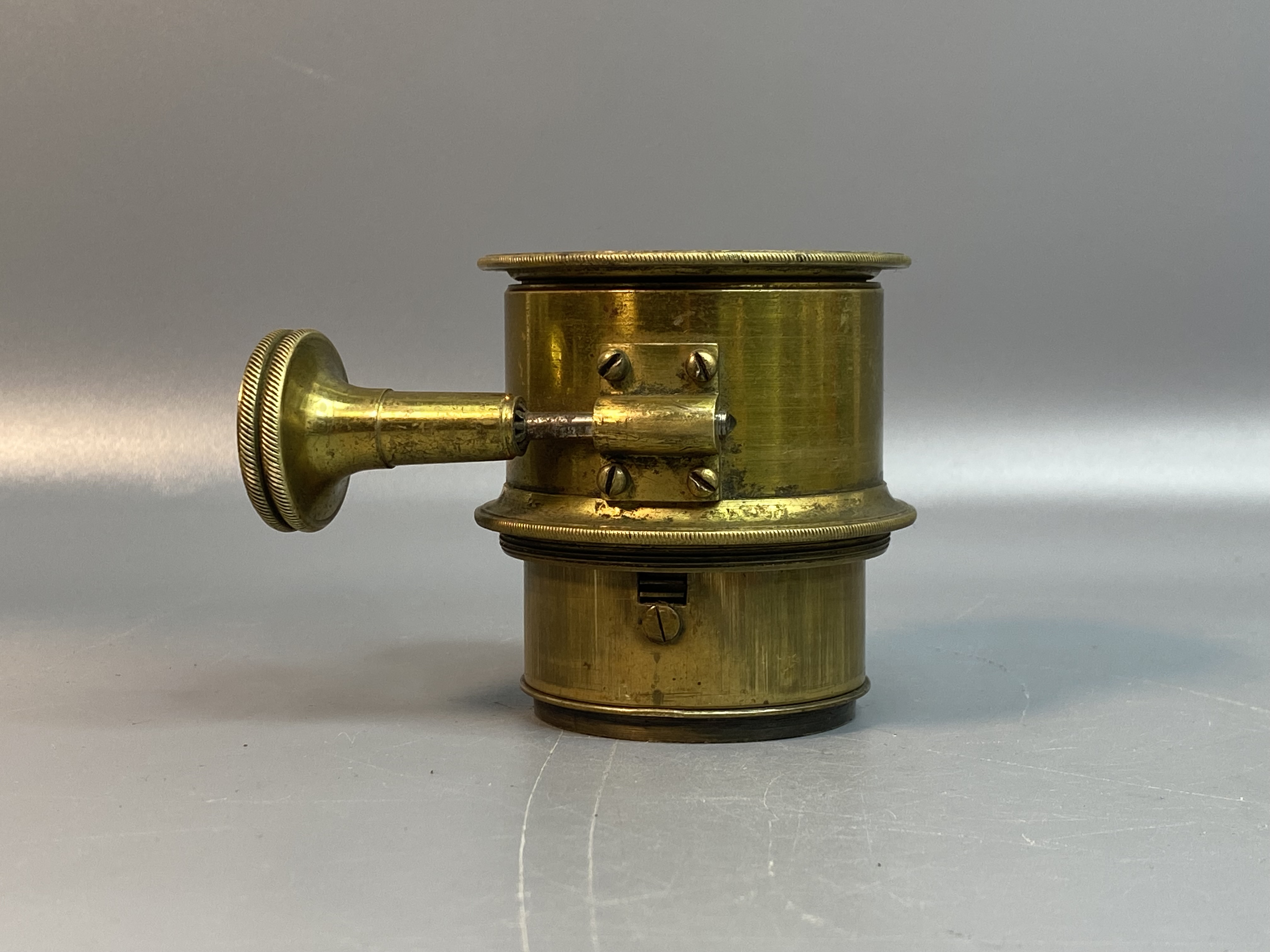 Боковая ручка — вероятно, служит для регулировки фокуса или диафрагмы. В некоторых моделях Dallmeyer использовалась регулировка воздушного зазора между линзами.