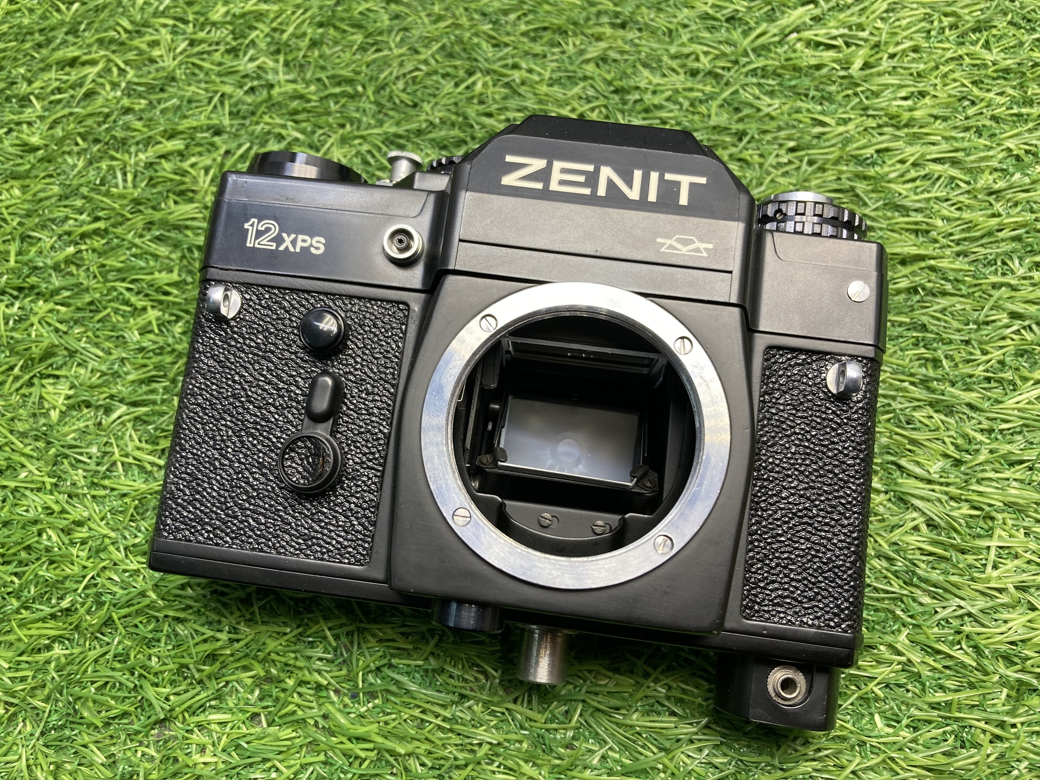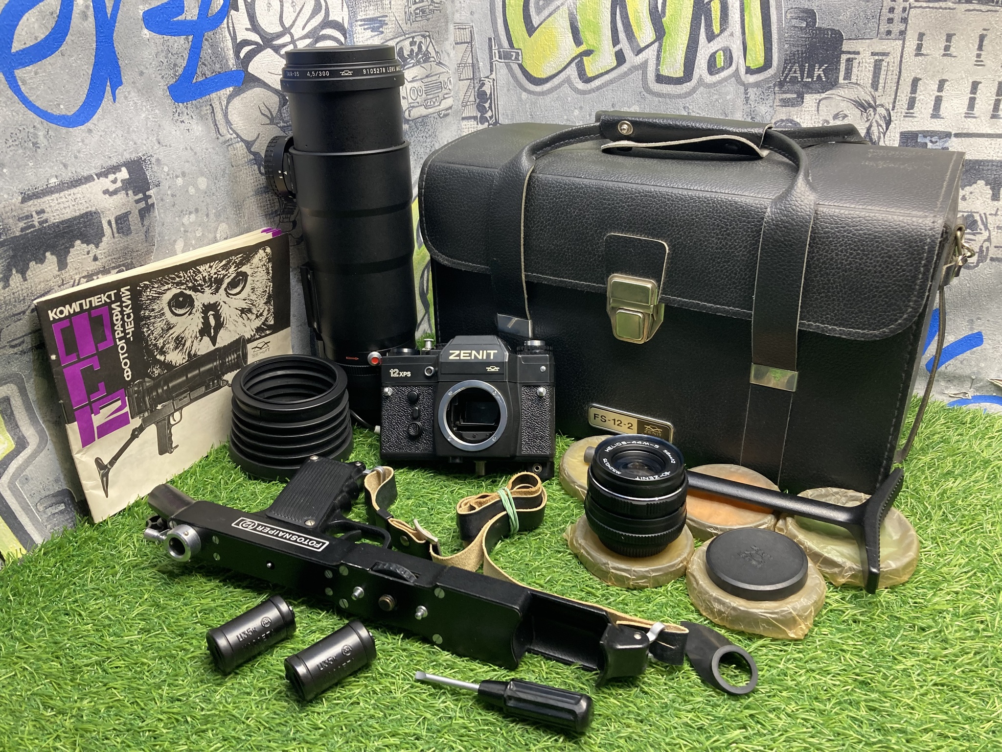 Комплект в боксе - камера Зенит 12XPS , объектив Таир-3S 4,5/300, сменный объектив Гелиос-44М-5, приклад, бленда, 5 светофильтров, наглазник, барабаны для пленки, оригинальная отвертка.