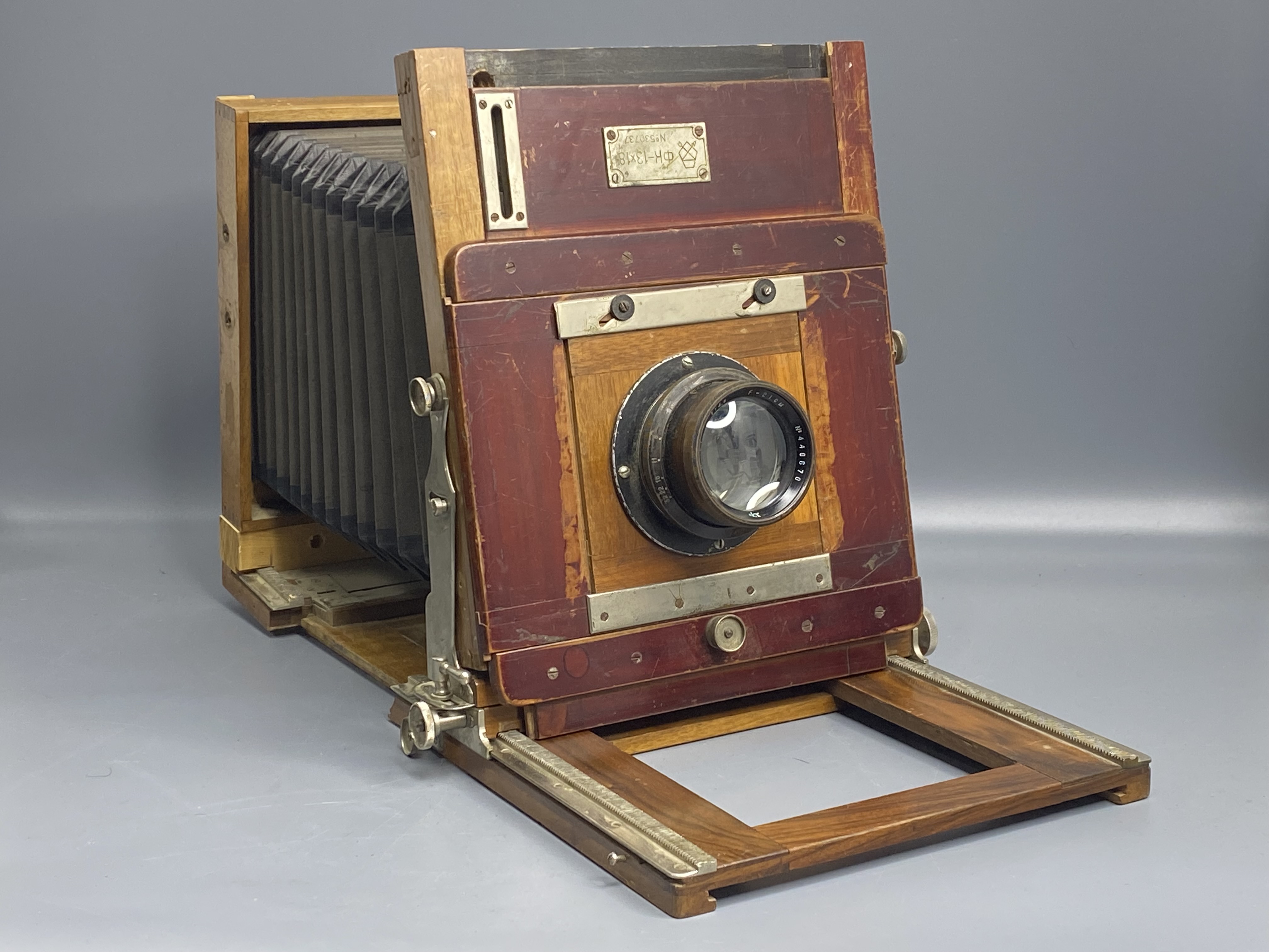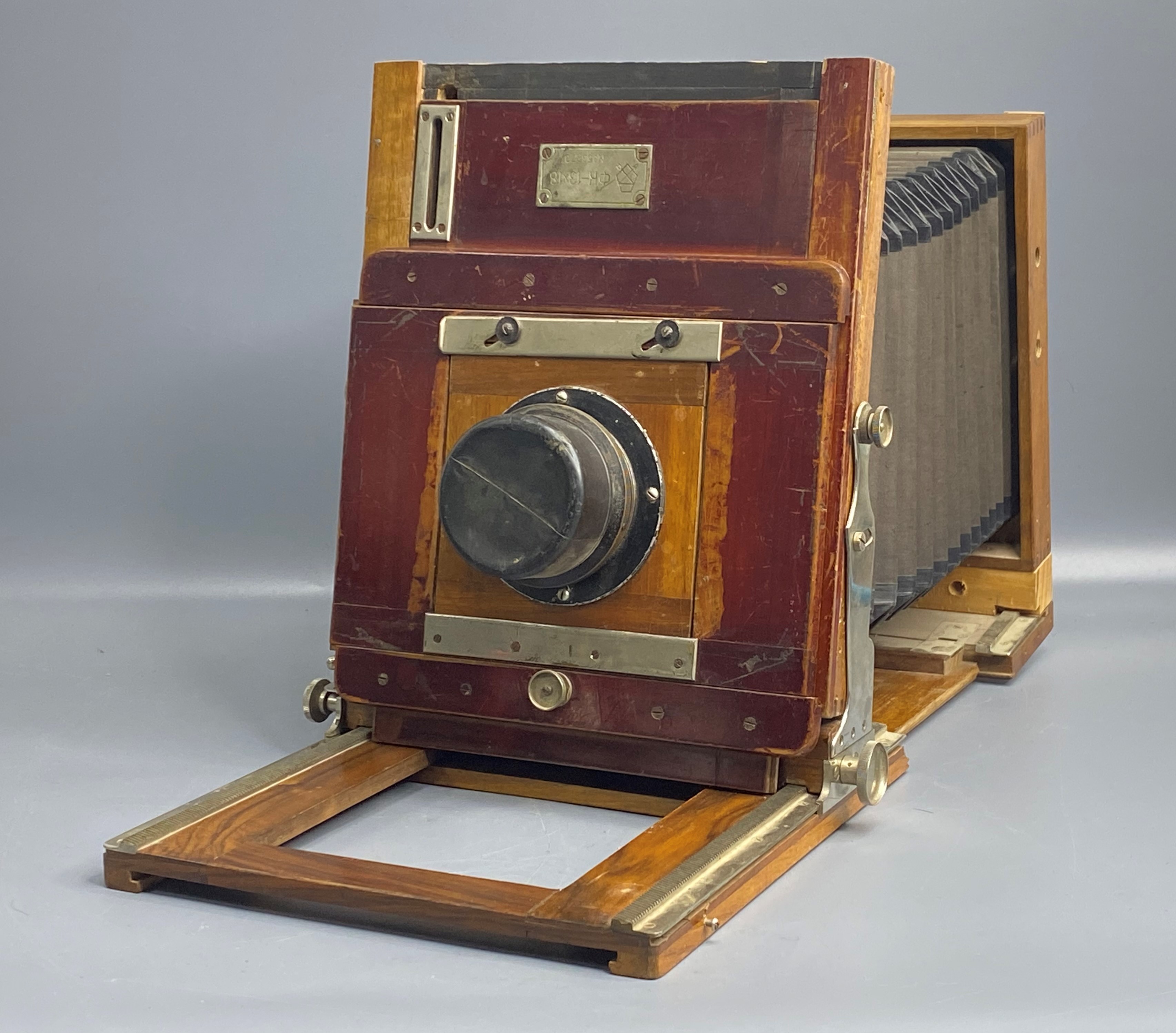ФК 13×18 с объективом Индустар-51 — классическая форматная камера с кадром 13×18 см и квадратным мехом двойного растяжения. Корпус складной, выполнен из красного дерева, что придаёт устройству эстетичный и винтажный вид. Точная фокусировка осуществляется передвижением задней рамки с матовым стеклом посредством кремальеры. Объективная доска снабжена горизонтальными и вертикальными подвижками для точной композиции и коррекции перспективы. Объектив Индустар-51 обеспечивает высокую резкость. Экспозиция производится вручную — открытием крышки объектива. Отличный выбор для художественной и студийной съёмки.