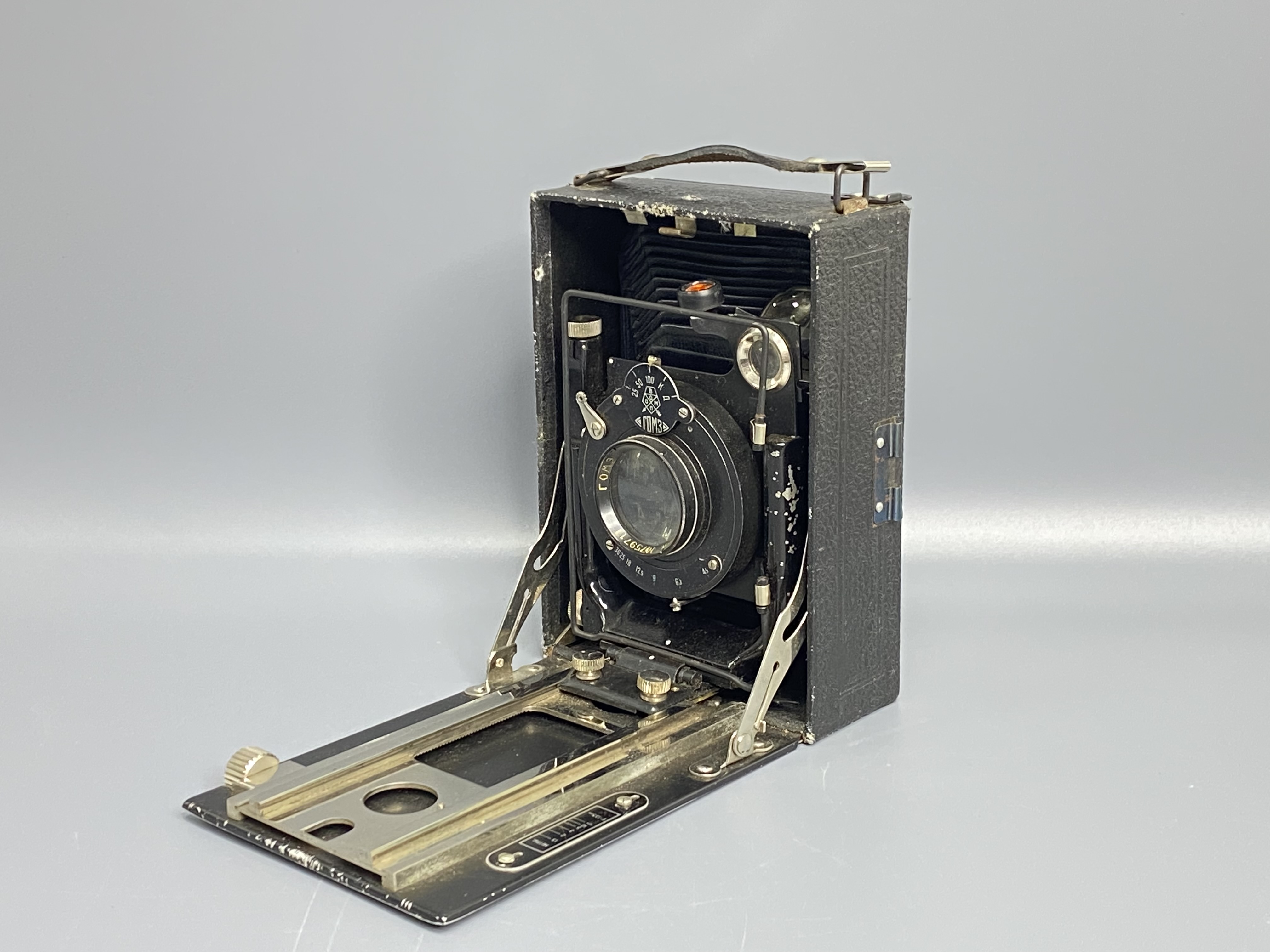 Это складной среднеформатный фотоаппарат «Фотокор-1» (также известный как «Фотокор №1»). Это была первая по-настоящему массовая советская фотокамера, выпускавшаяся с 1930 по 1941 год на заводе ГОМЗ в Ленинграде.