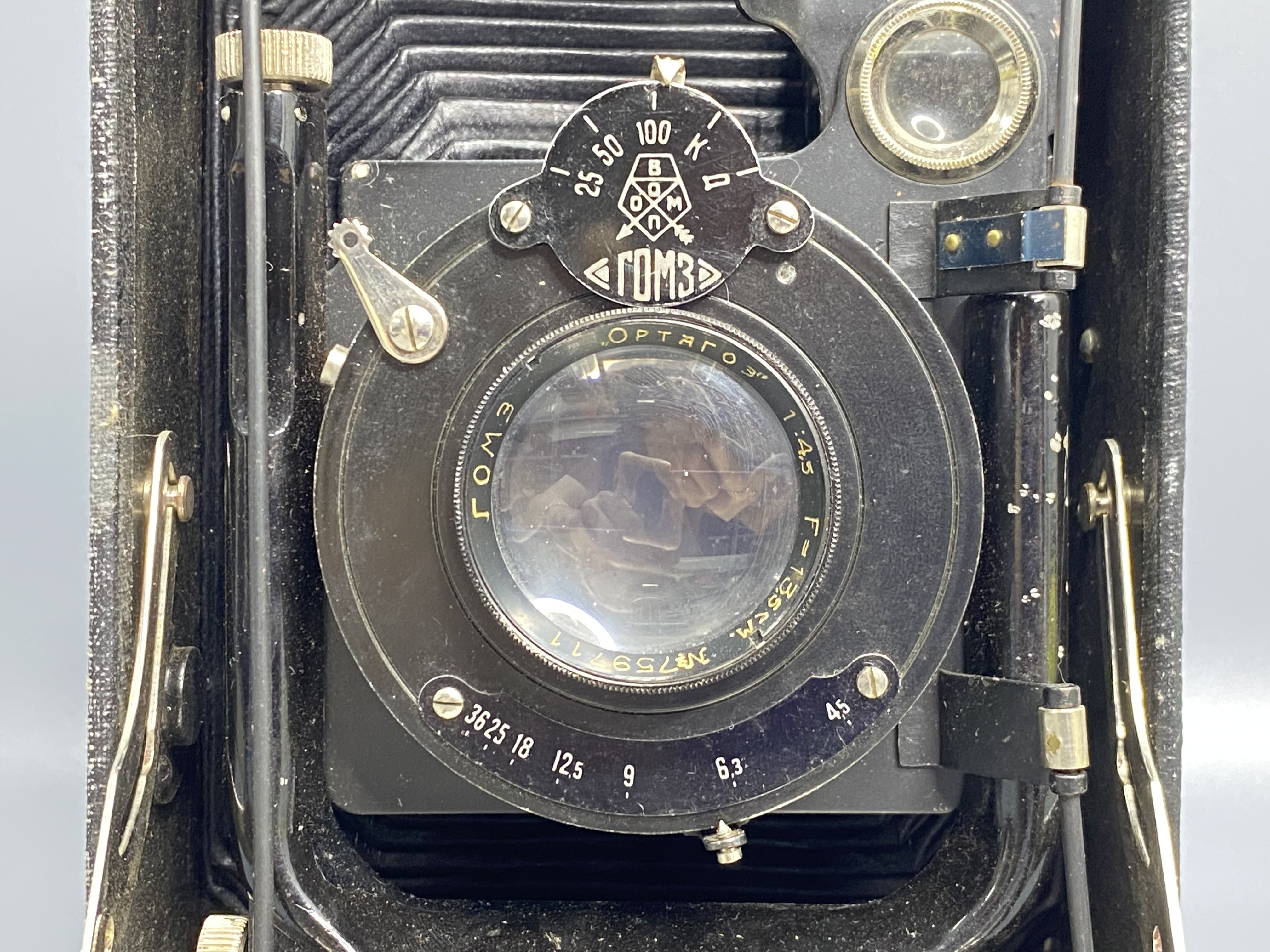 Объектив: На фото виден «Ортагоз» (анастигмат) с фокусным расстоянием 135 мм и светосилой f/4.5. Это был весьма продвинутый объектив для своего времени.