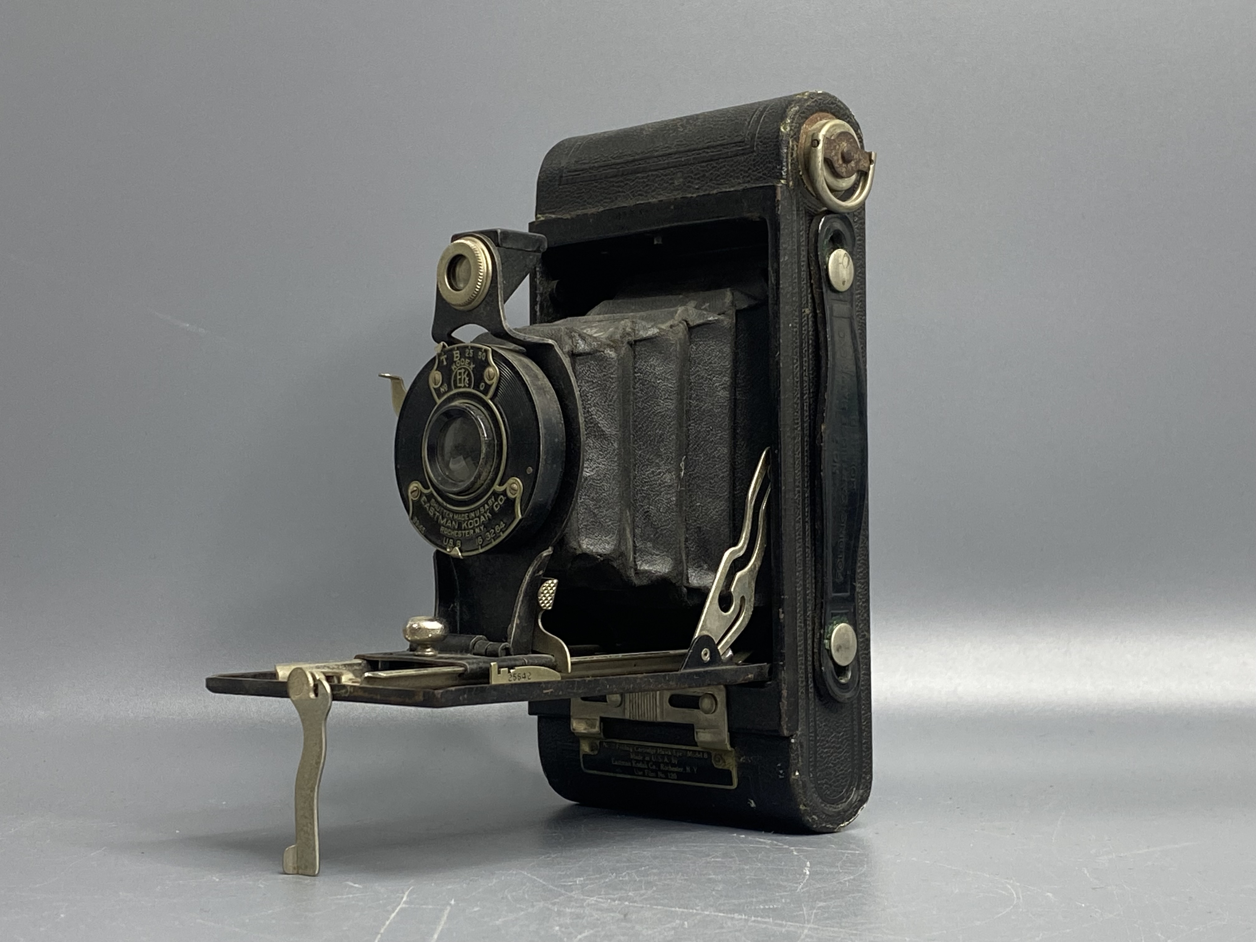 Данный экземпляр оснащен объективом Anastigmat Kodeye с затвором Kodex No. 0, выдержки B, T, 1/25 и1/50. Фотоматериал - пленка типа 120, размер кадра 6х9 см. Kodak Eastman No 2 Folding Cartridge Model B очень интересный и красивый экземпляр для коллекции, а также творческих экспериментов.