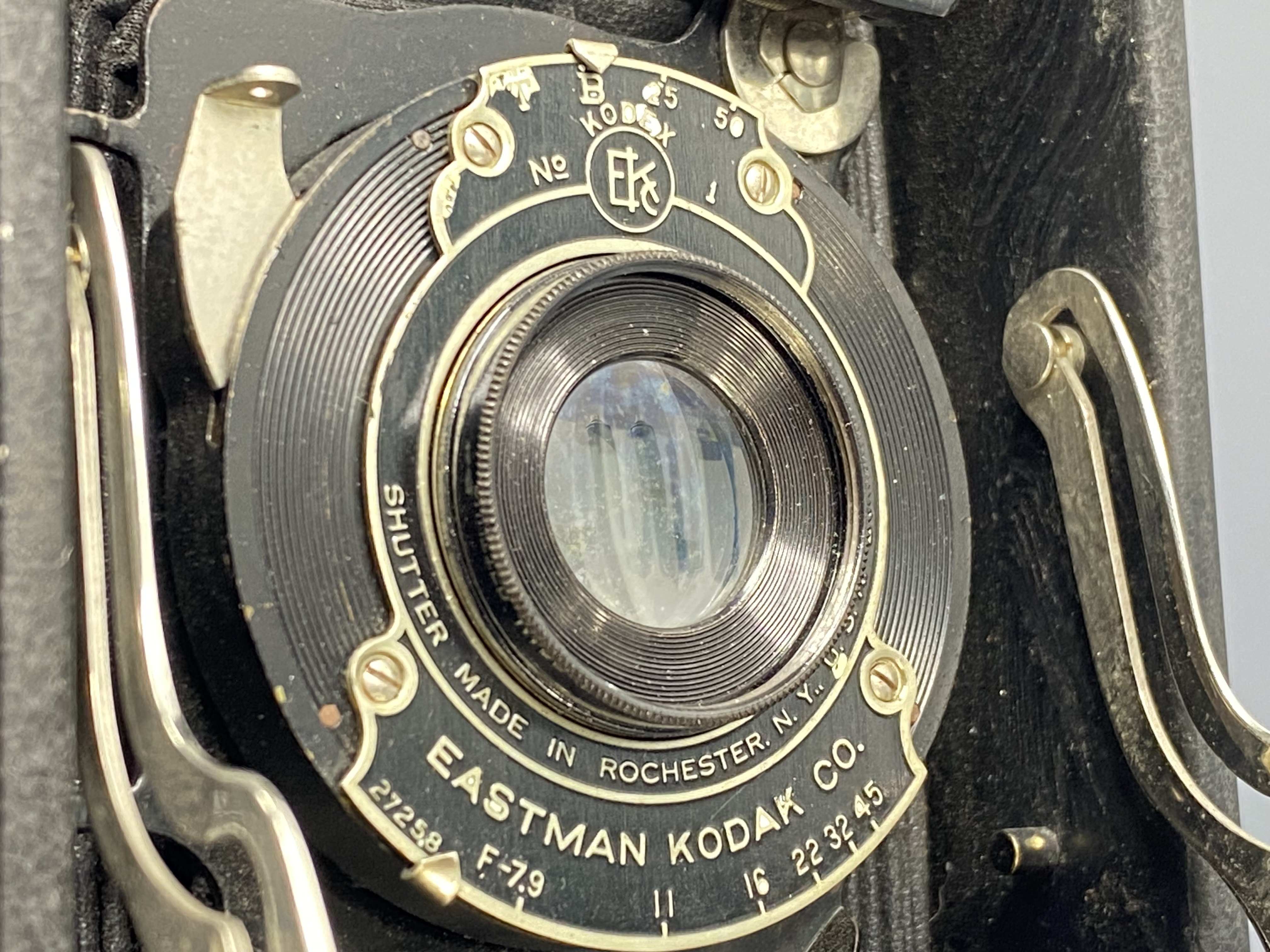 Затвор: Знаменитый Kodak Ball Bearing («шарикоподшипниковый»). Цифра «1» рядом с логотипом EKC (Eastman Kodak Company) — это часть маркировки модели затвора. Что это означает: компания Kodak выпускала затворы «Kodak Ball Bearing Shutter No. 1.» (на шарикоподшипниках) в разных размерах под разные форматы камер. Размер No. 1 — это стандартный размер затвора, который устанавливался именно на складные камеры No. 2 Folding Autographic Brownie. Он рассчитан на работу с объективами умеренной светосилы (как Kodar f/7.9) и обеспечивает базовый набор выдержек: 25 (1/25 сек), 50 (1/50 сек), а также режимы B и T.