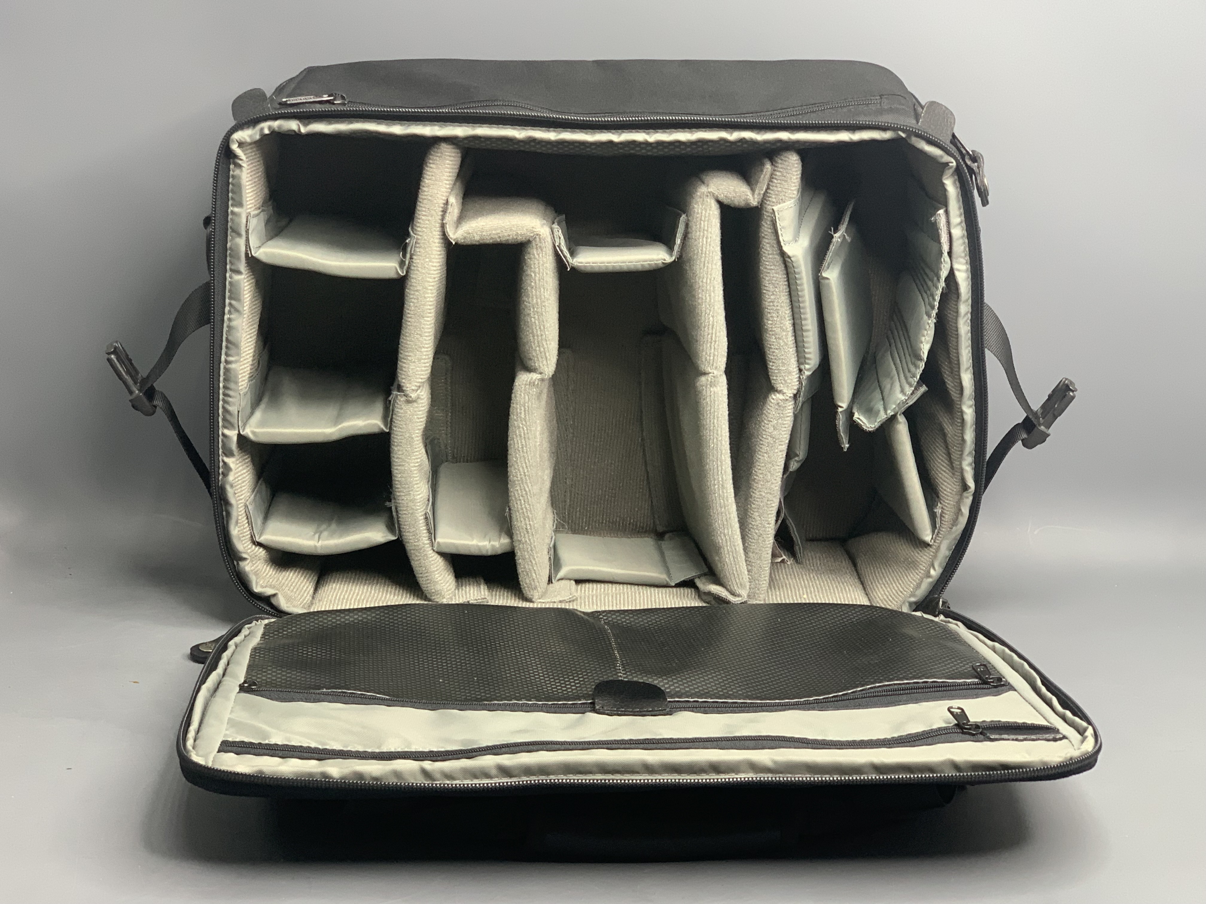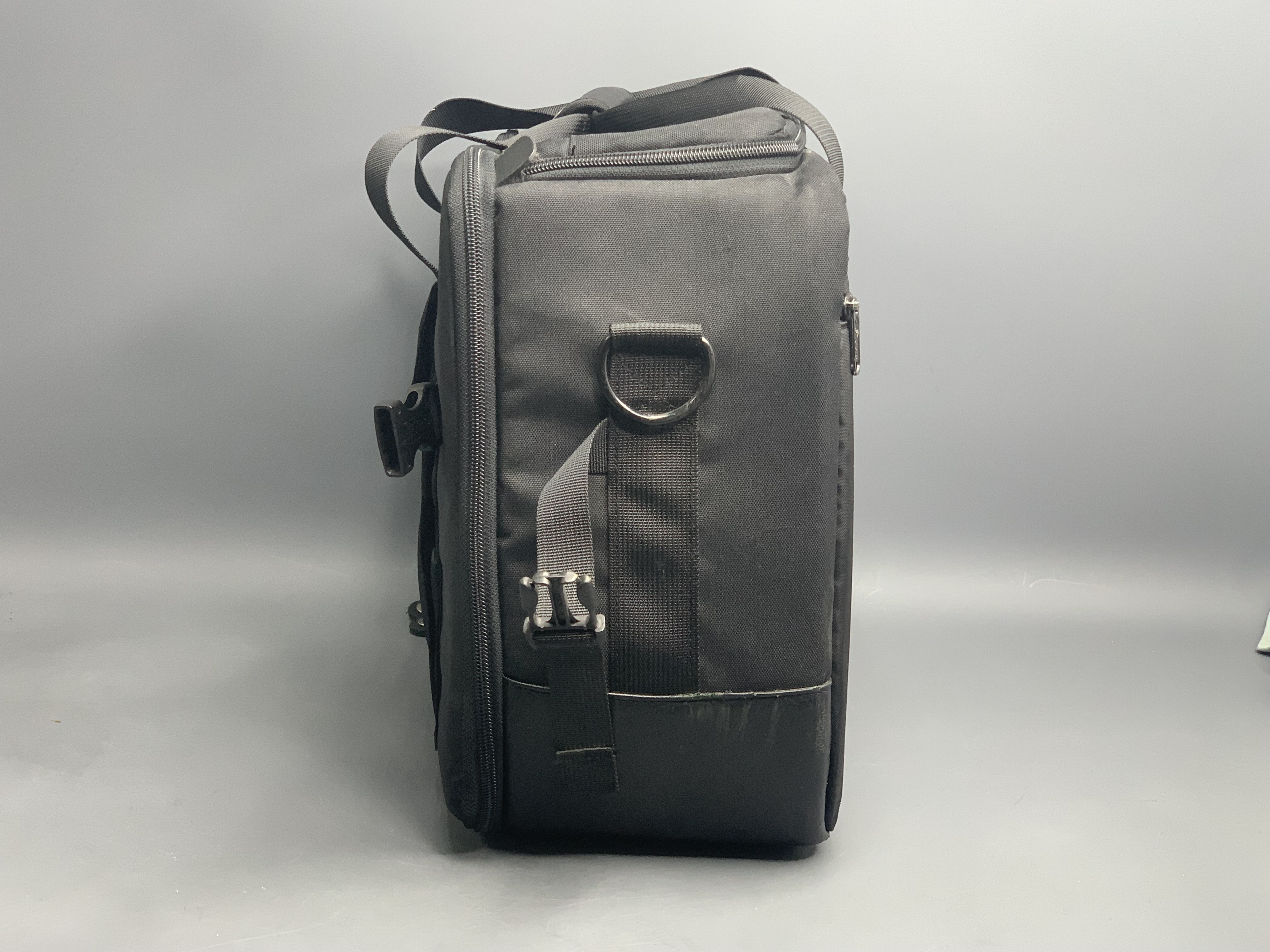Сумка представляет собой чрезвычайно вместительный прямоугольный кейс с ручкой, плечевым ремнём с прочными металлическими карабинами и ремнями для крепления штатива.