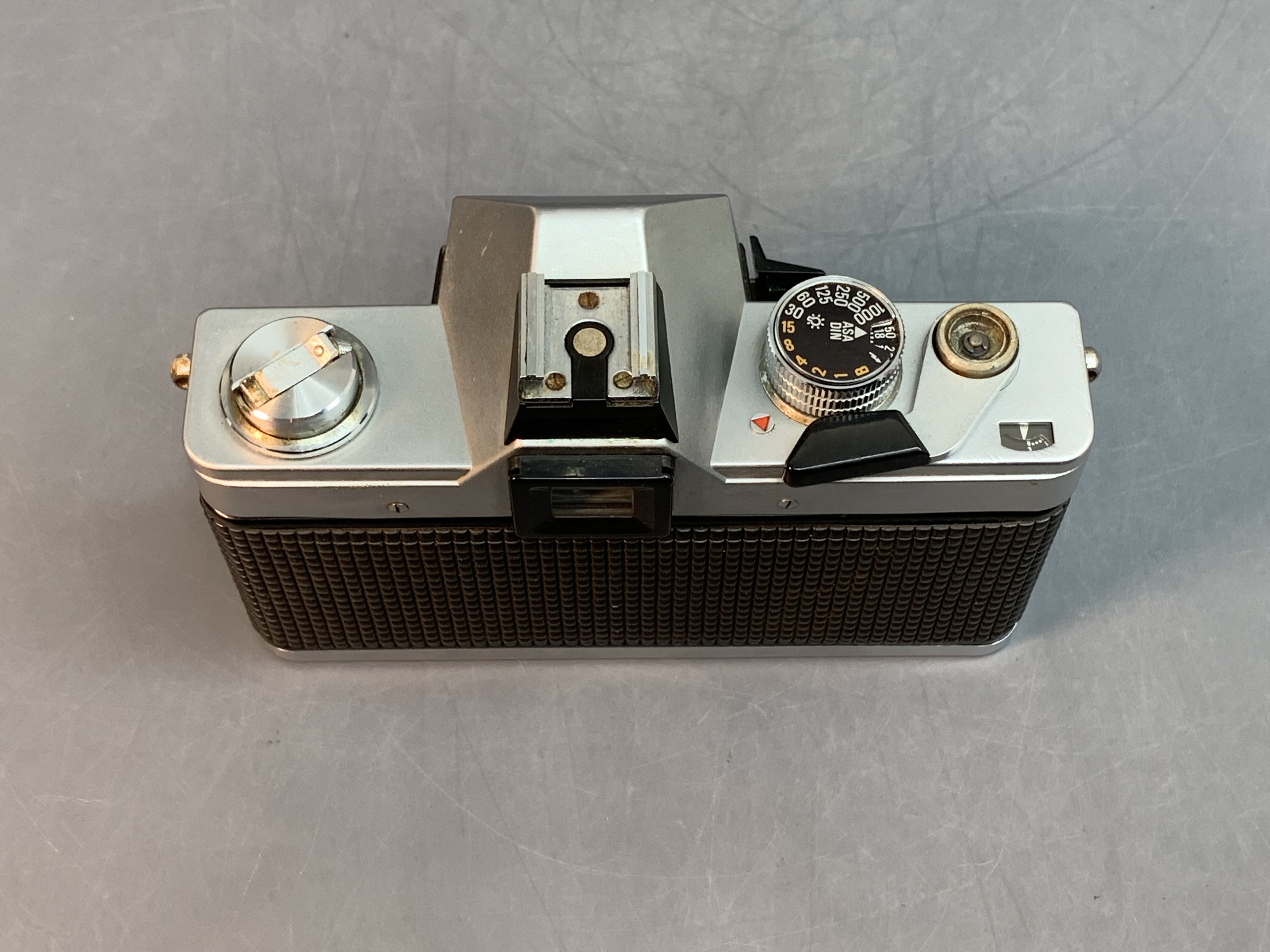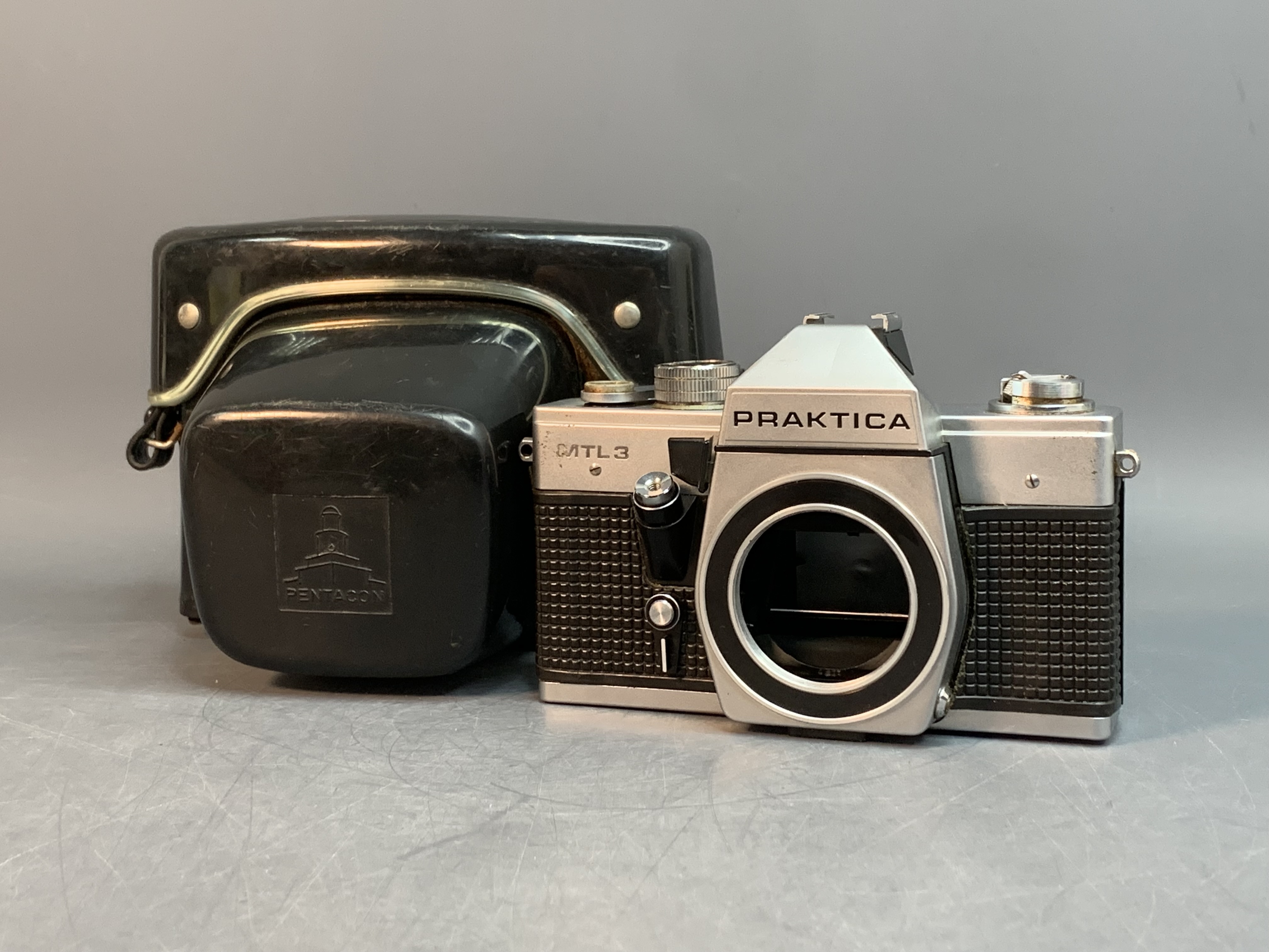 Немецкая зеркальная пленочная камера Praktica MTL 3. Фотоаппарат имеет TTL замер экспозиции, вертикальные металлические шторки, затвор отрабатывает выдержки от 1 секунды до 1 / 1000s + B.