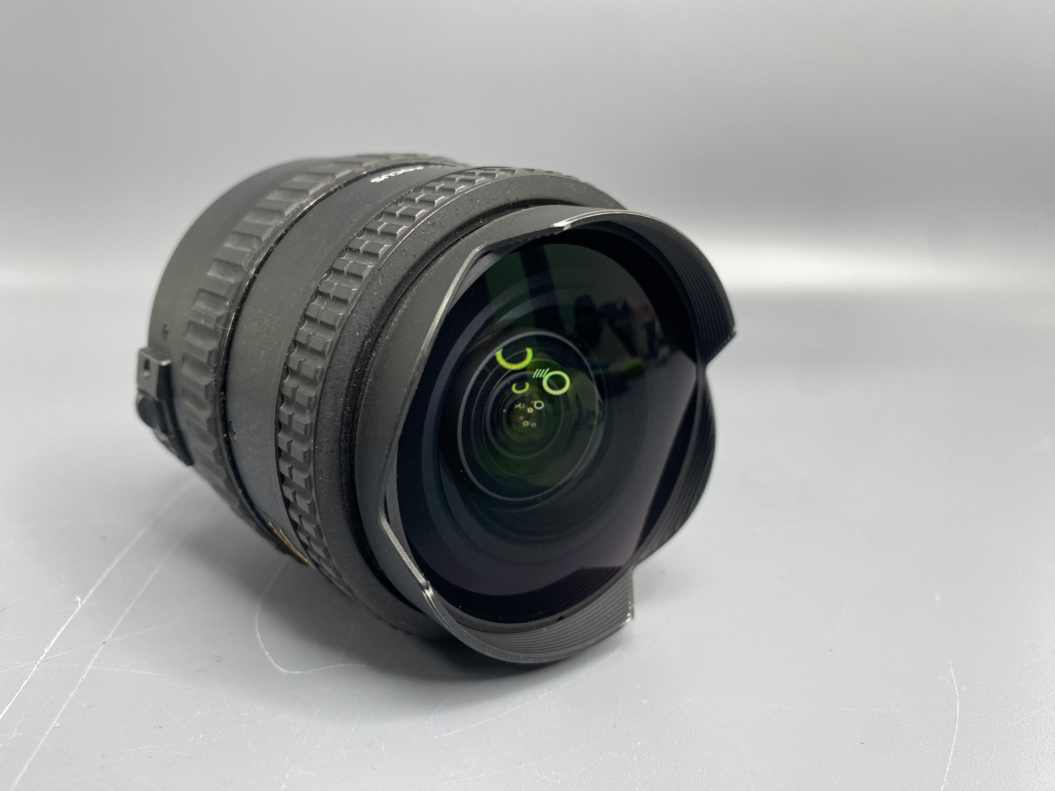 Угол обзора изменяется от 100 до 180 градусов по диагонали. Передний оптический элемент покрыт влагозащитным составом (WaterProof). Это покрытие значительно облегчает очистку передней линзы объектива от отпечатков пальцев и пятен (от капель воды) по сравнению со стандартным многослойным покрытием. В состав задней оптической группы входит один супер-низкодисперсионный элемент (Super-Low Dispersion). Выпуклая передняя линза не позволяет устанавливать светофильтры. Имеется встроенная лепестковая бленда. Прекрасно подойдет для воплощения различных творческих задумок.