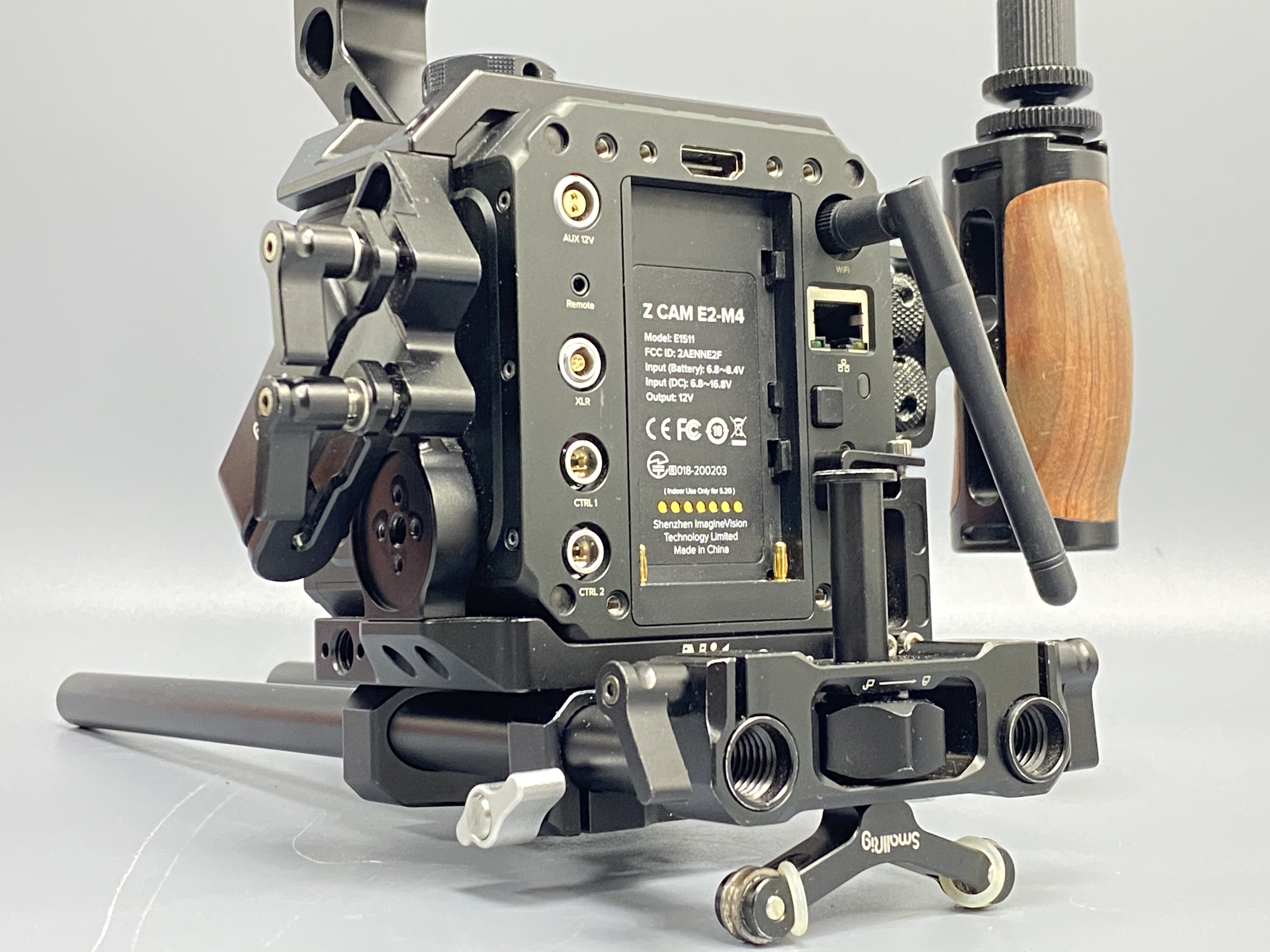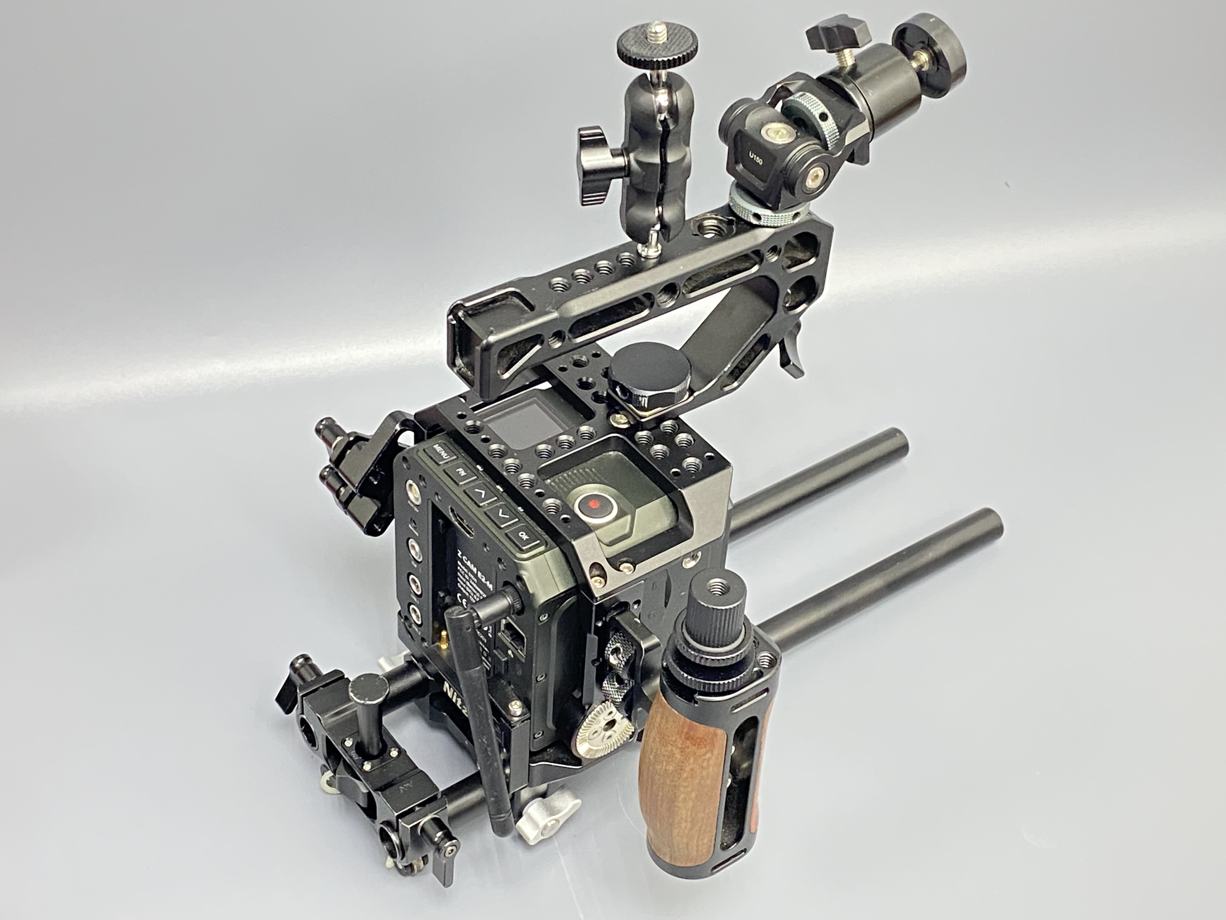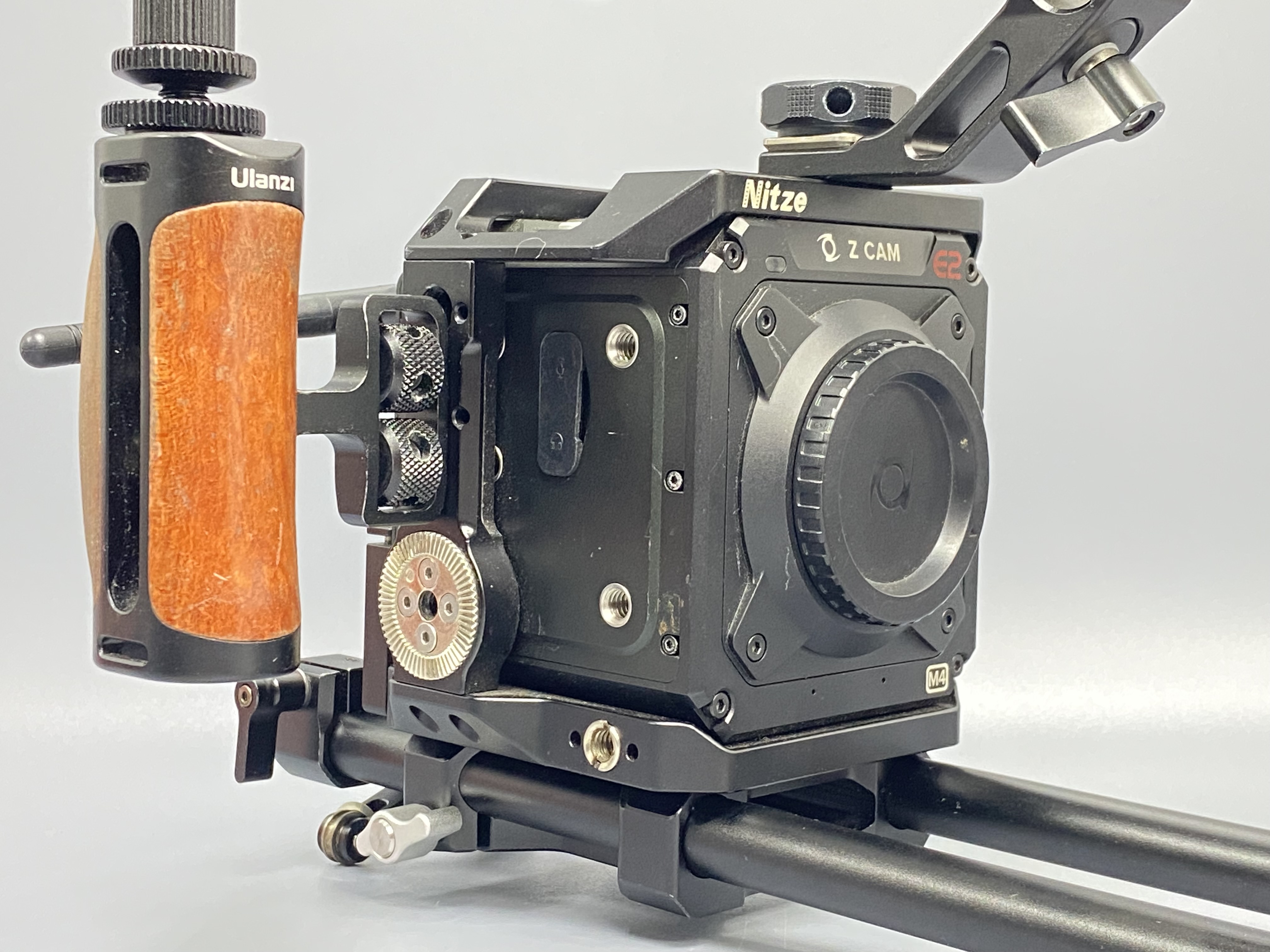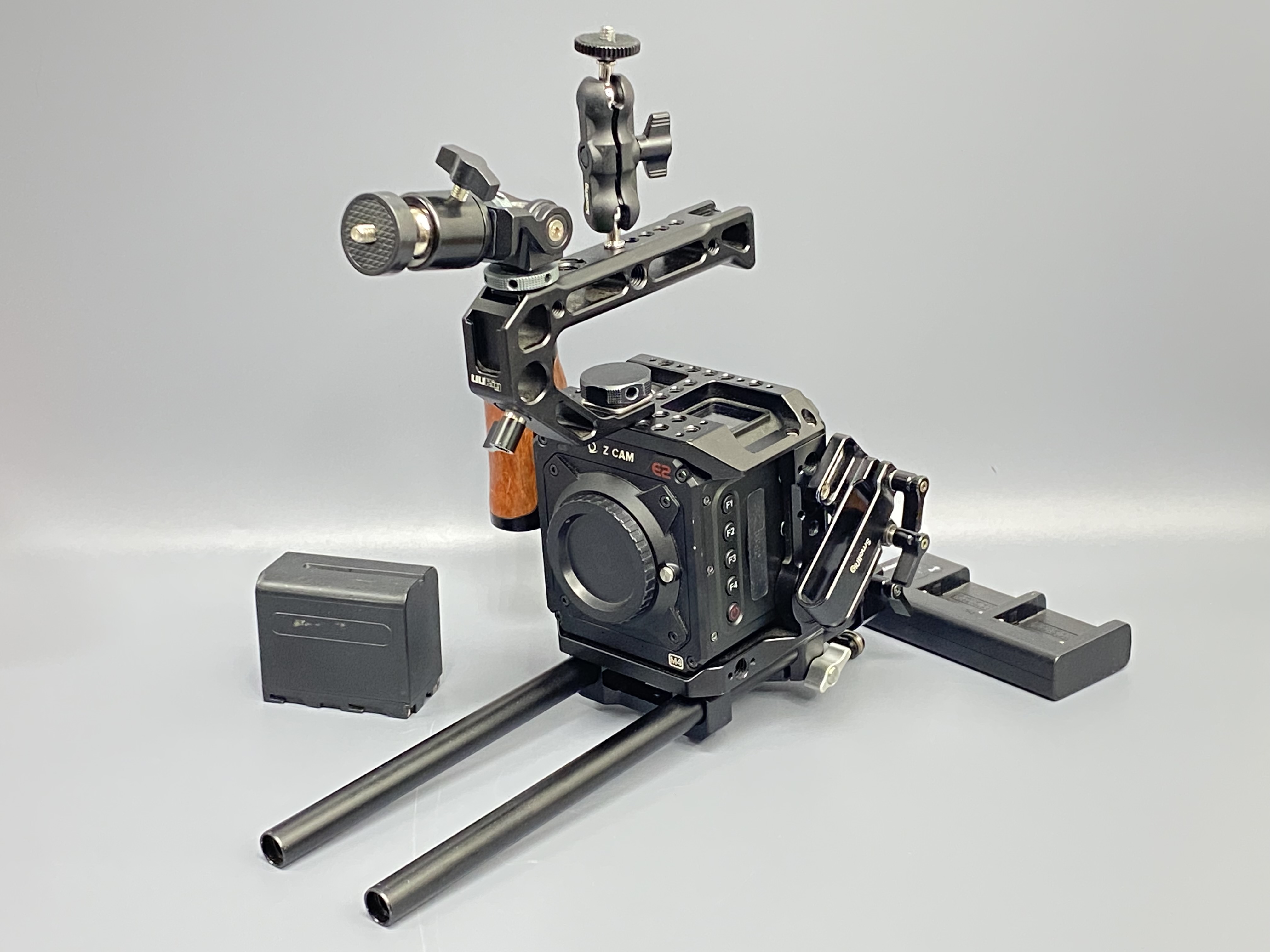 Видеокамера Z Cam E2-M4 + клетка Nitze Cage TP-E2-FS + крепление монитора UURig U150 + силовая опорная плита для стабилизатора SmallRig Power Supply Base Plate 3252 + опорная плита Falcam с установленным рельсом + шарнирный кронтштейн SmallRig Magic Arm + зарядное устройство на 2 аккумулятора + АКБ