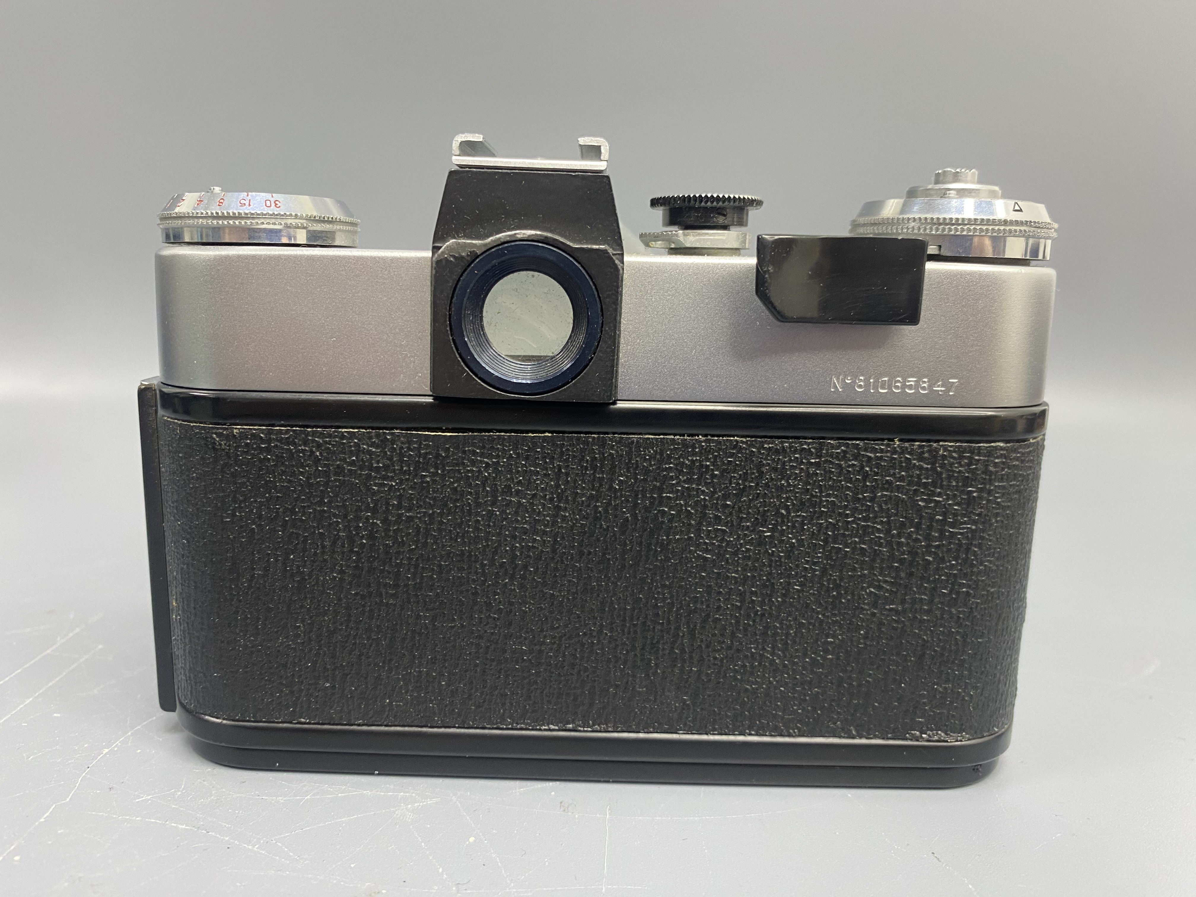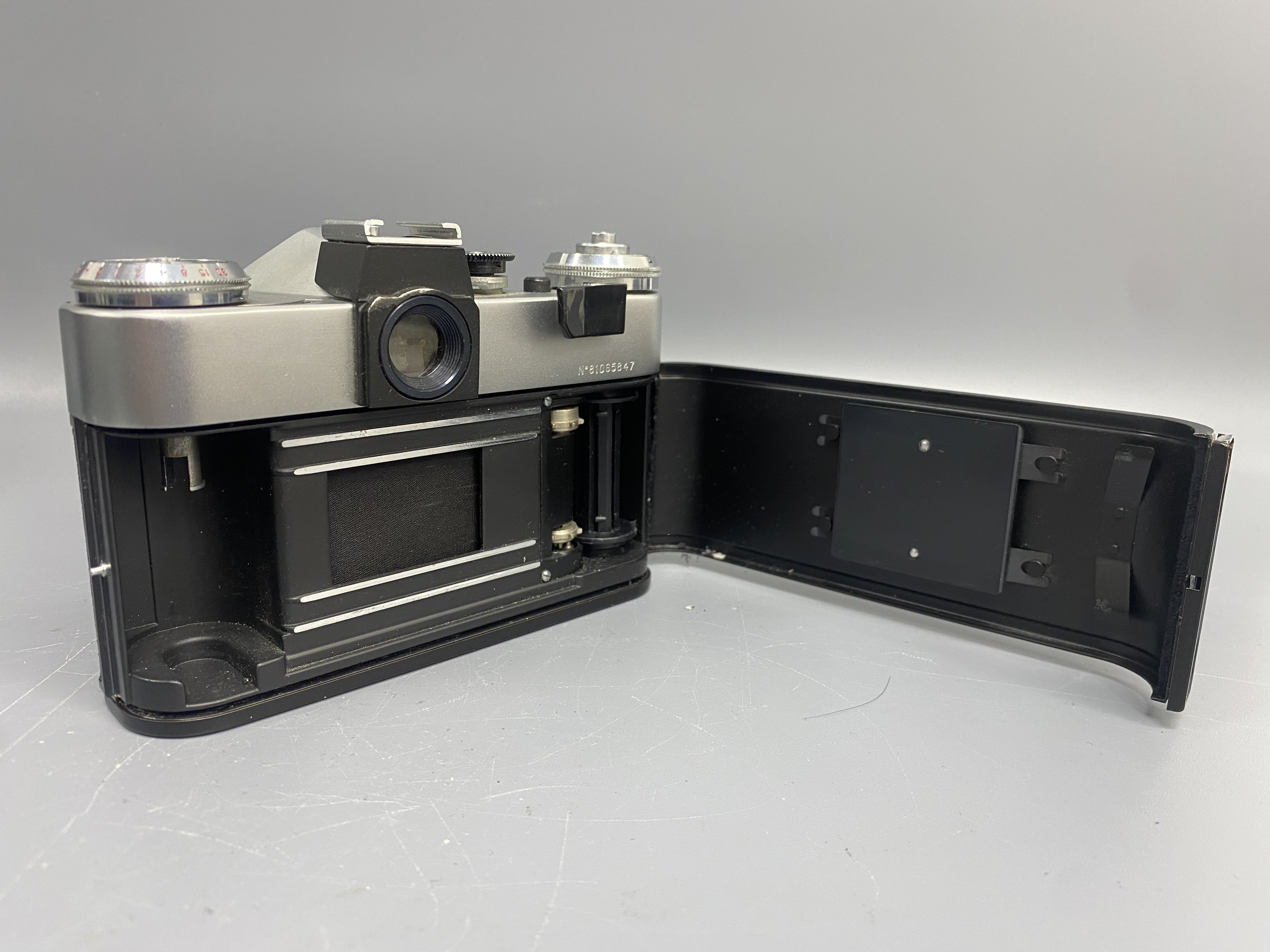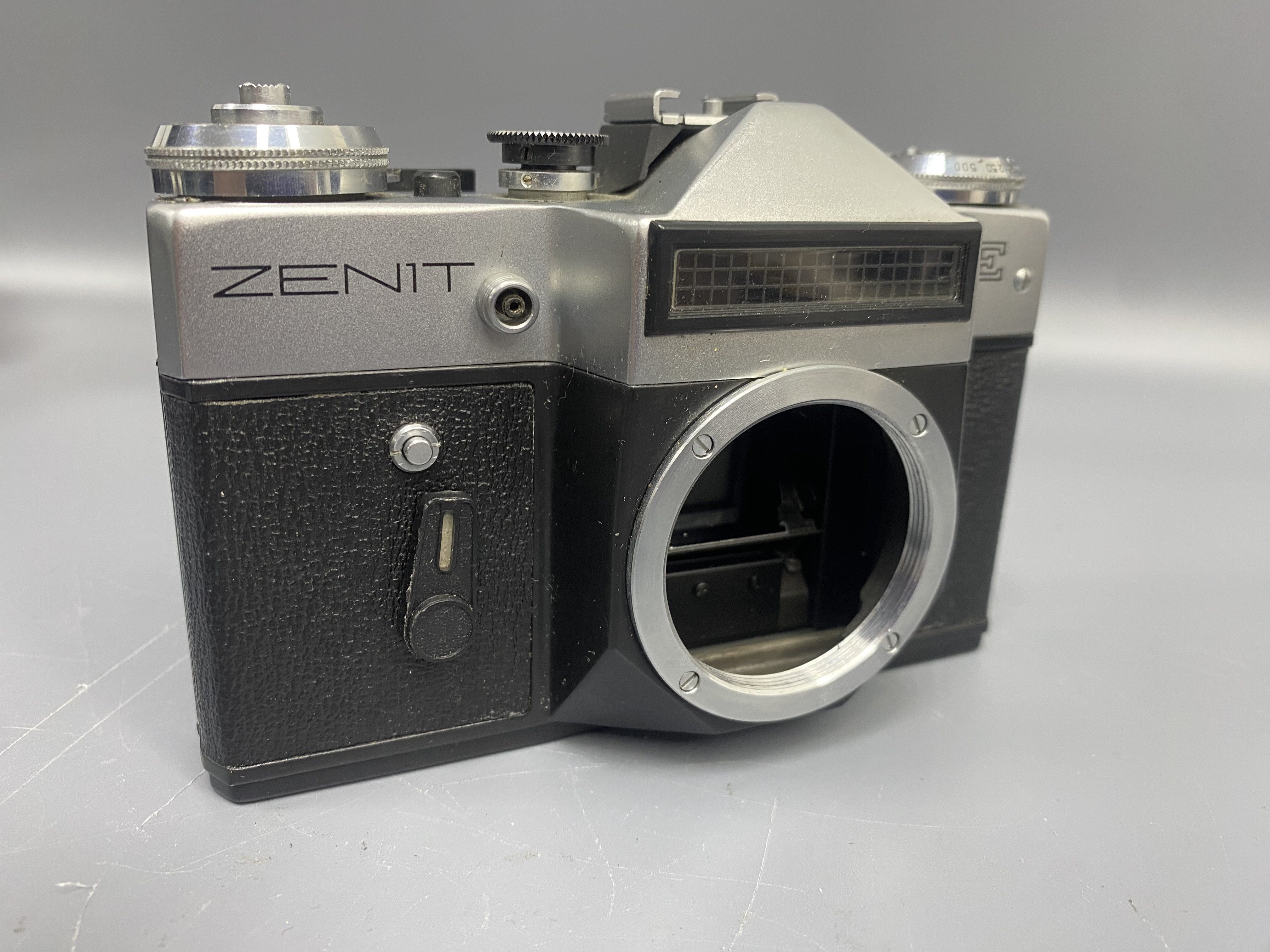 Советский зеркальный пленочный фотоаппарат Зенит-Е. Тип затвора механический, шторно-щелевой, с горизонтальным движением матерчатых шторок. Оснащен встроенным несопряжённым экспонометром с селеновым фотоэлементом. Видоискатель зеркальный с несъёмной пентапризмой и матовым стеклом. Фотоматериал плёнка типа 135, размер кадра 24×36 мм.